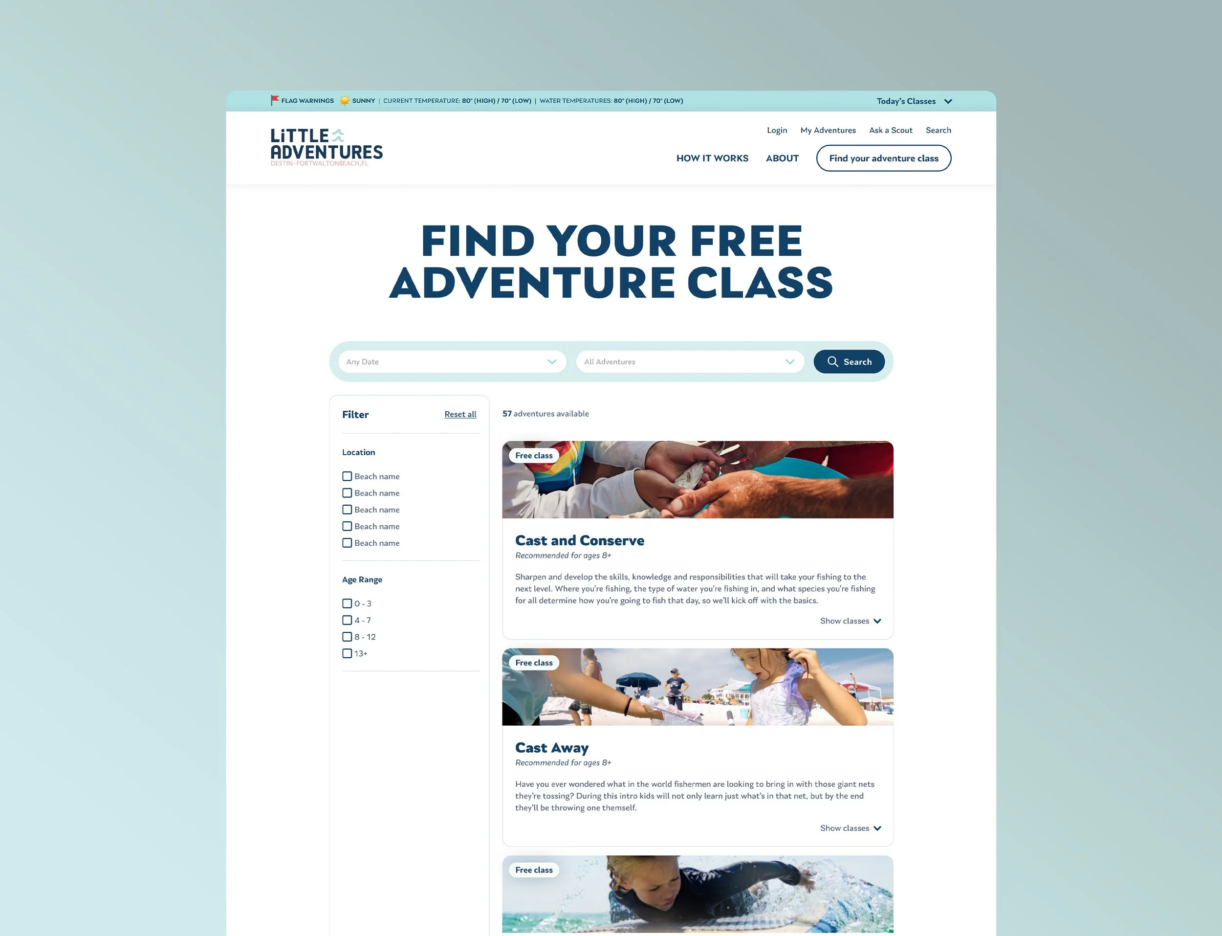 The original website functioned primarily as a class registration tool. We needed to redesign to clarify the program’s value, improve the user experience, appeal to teens (not just younger children), and elevate credibility by highlighting program scale and tourism backing. At the same time, the site needed to evolve from static listings into a dynamic, mobile-friendly companion that encourages on-the-spot participation.